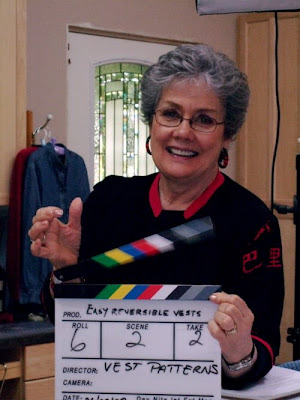 Boy, the last few weeks have been a real whirlwind of travel. First, I traveled to the wonderful conference in Stanley, Idaho to teach for the Sawtooth Mountain Mamas. I returned home and two days later, flew to the west coast to film my new companion DVD for my newest book, Easy Reversible Vests-Revised Edition.   This book is currently available in my web store. I was so thrilled to have the opportunity to produce a product that lets me personally take you step-by-step through the process of making vests that are so easy to make and fun to wear. Of course, I am a quilter and totally out of my comfort zone when it comes to lights, cameras and action. Thankfully, I had the staff of Nine Patch Media to take charge of all those elements. Here Chris Manuel, the Technical Director, is preparing one of the cameras.